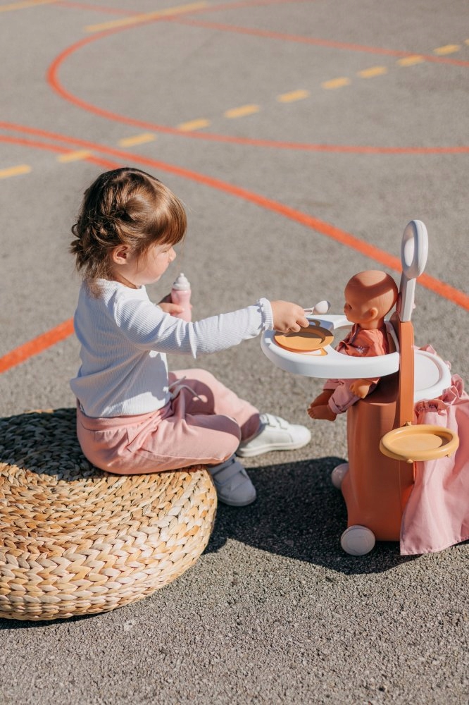 Девчачьи цвета, изящные детали и добротное качество изготовления заставляют набор Smoby восхищать каждого маленького воспитателя. В разложенном виде чемодан превращается в многофункциональный пост по уходу. С одной стороны расположен высокий стульчик для кормления с подносом, тарелкой, ложкой и бутылочкой. Зато есть кроватка с балдахином и одеялом – идеально подходит для сна после игр! По бокам есть полочки для аксессуаров и крючки, которые помогут поддерживать порядок во время ухода за малышом. Все это можно легко сложить в удобный чемодан на колесиках с выдвижной ручкой, который можно взять с собой в поездку или хранить. В набор входят шесть реалистичных аксессуаров для ухода, которые делают игру еще более увлекательной.