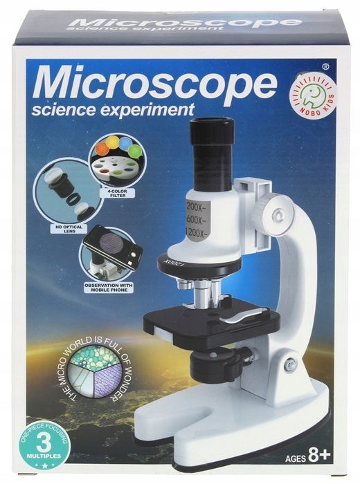 В микроскопе есть все необходимое для рассмотрения микромира. Оснащен вращающейся головкой с тремя видами увеличения 200х/600х/1200х и возможностью регулировки фокуса.