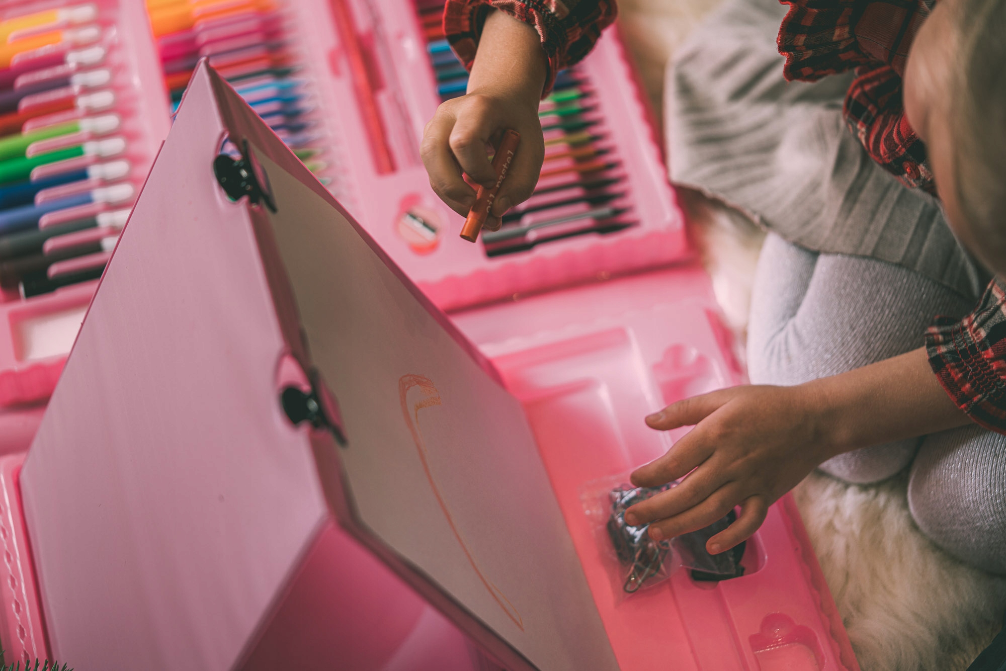 Мелки, краски, пастель, фломастеры и аксессуары – все заключено в розовый чемоданчик, благодаря которому ребенок легко сможет поддерживать порядок и брать набор куда захочет.