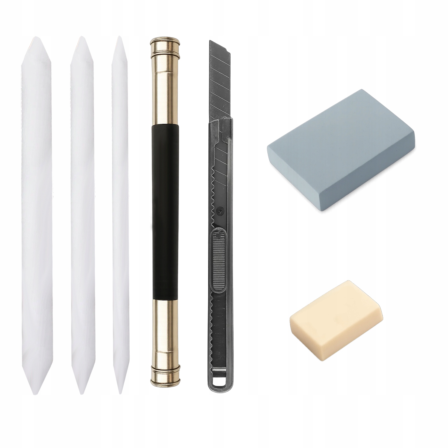 В комплект также входят 2 ластика, 4В и классический, которые позволяют точно удалять графит с бумаги - не размазывая и не повреждая поверхность. Идеально подходит для исправления деталей и очистки эскизов.