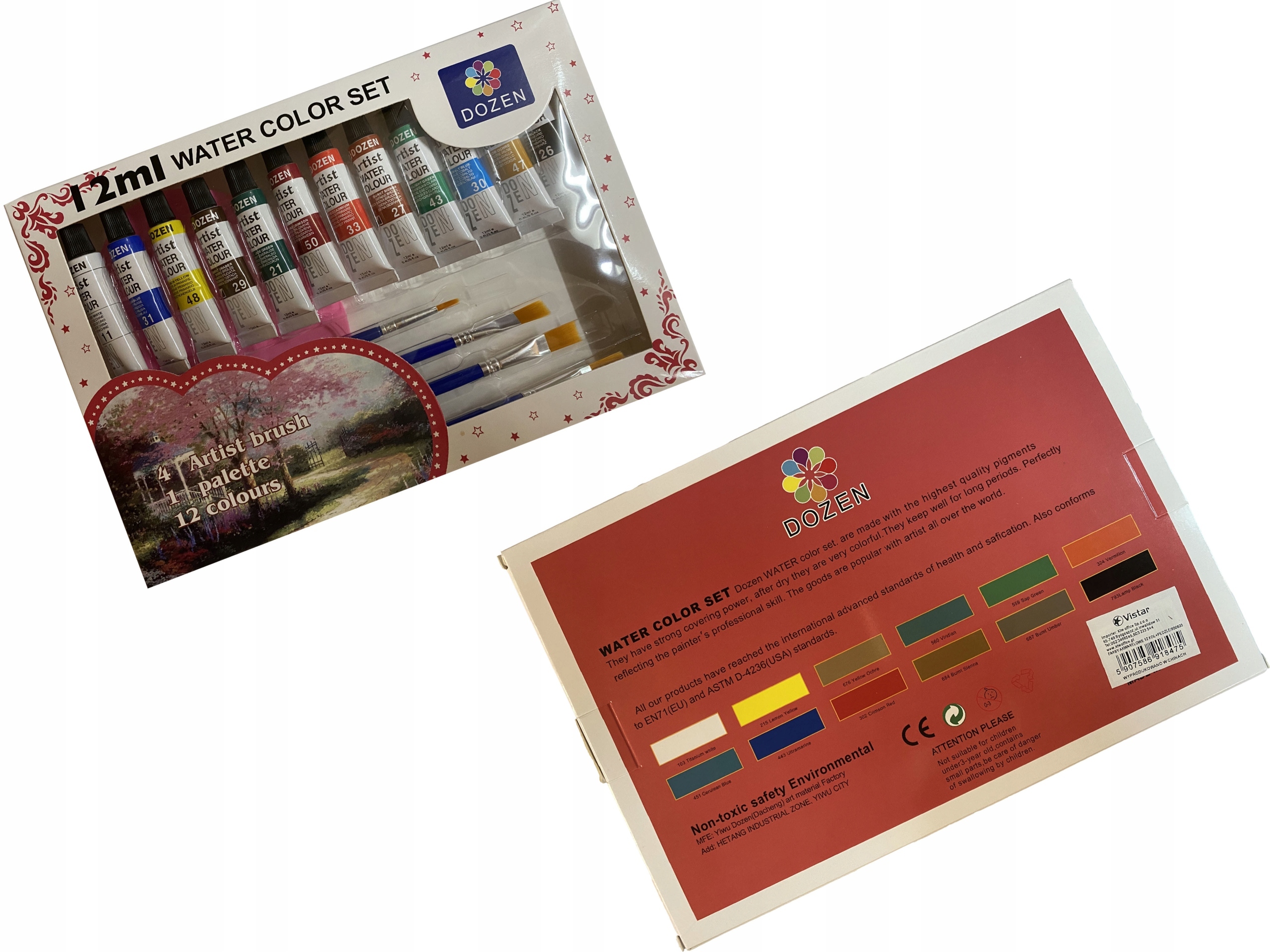 Набор акварельных красок из 12 цветов: Белый, Оранжевый, Синий, Черный, Различные оттенки зеленого, Различные оттенки красного, Желтый, Зеленый, Темно-синий
