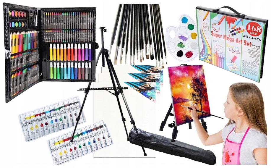 С большим выбором краски, мелки, ручки, пастель, масло, сухая свечная пастель, акварельные краски, маленькая кисть, губка, карандаш, ножницы, точилка, клей, линейка и разноцветные скрепки, а также аксессуары, такие как холсты для рисования, набор кистей и СКЛАДНОЙ АЛЮМИНИЕВЫЙ ЭЛЬребенок с легкостью создаст самые изысканные, креативные и оригинальные работы.