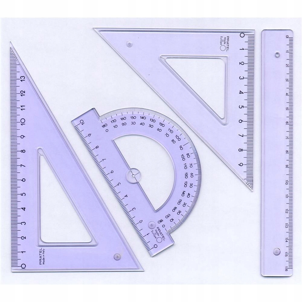 Чертеж PRATEL В набор входит: линейка 16 см, набор угольников со шкалой 10 см и 14 см, транспортир 180 градусов.