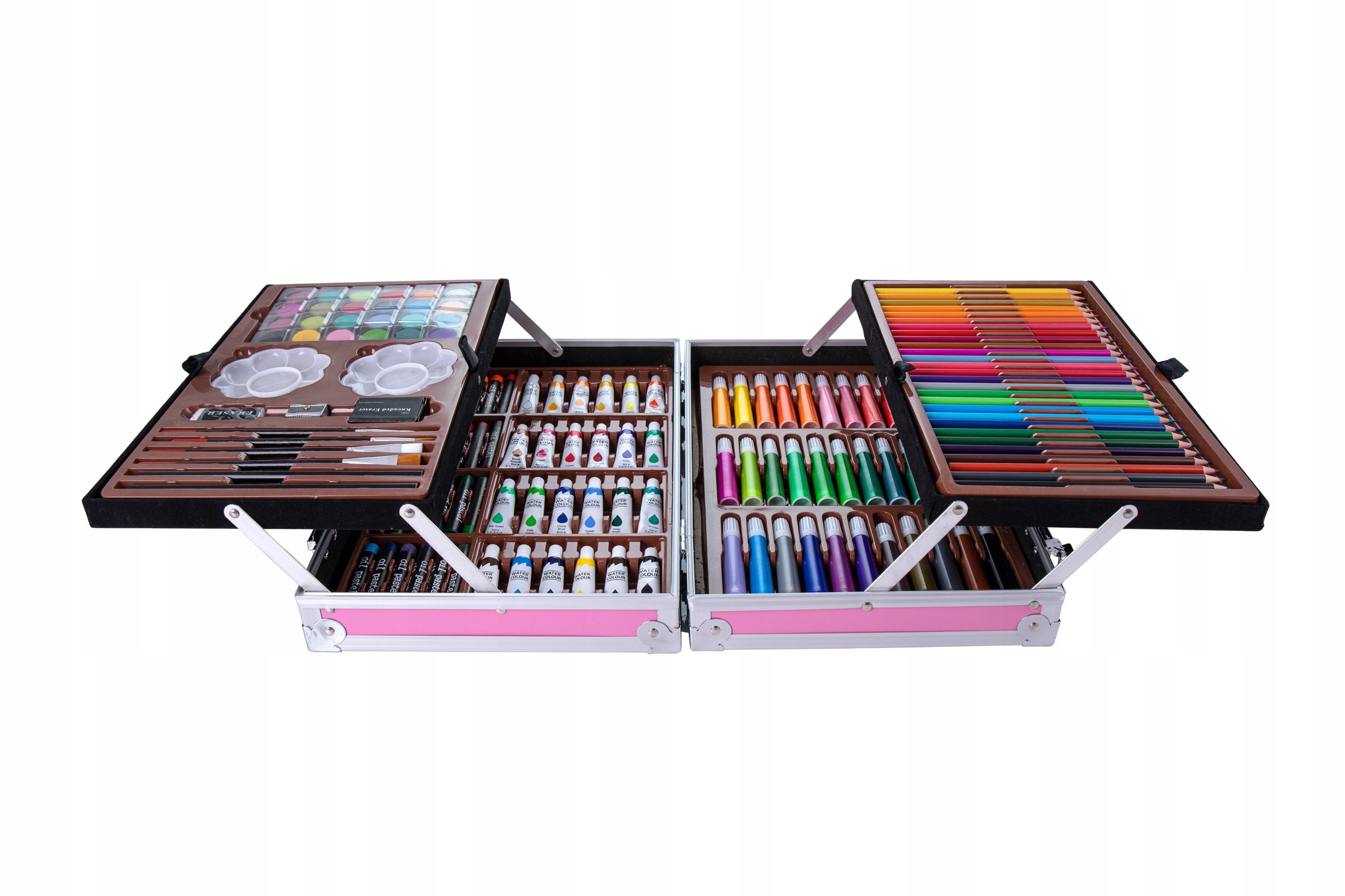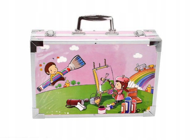Набор для рисования и рисования помещен в специальный кейс – алюминиевый чемодан. Имеет рельефные отделения для мелков, фломастеров, красок и аксессуаров. Чемодан состоит из четырех частей, боковые представляют собой приподнятые полки, обеспечивающие лучший доступ к содержимому.