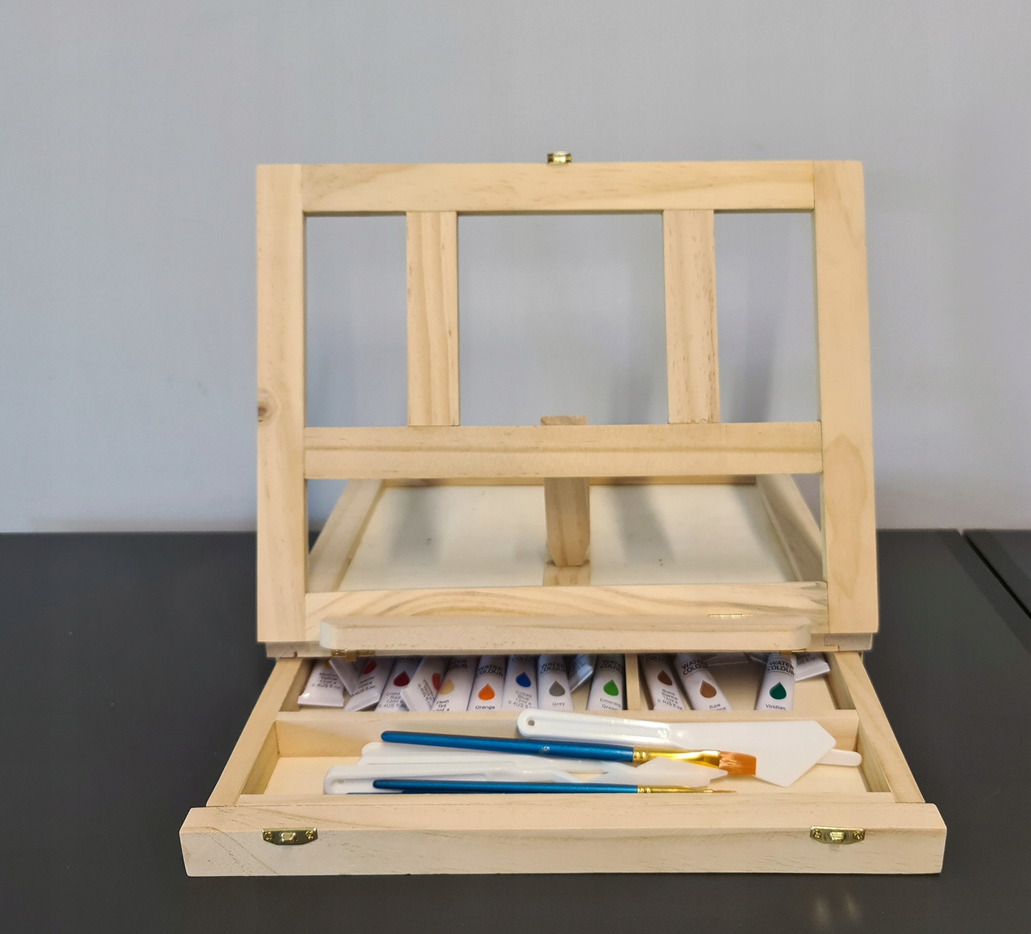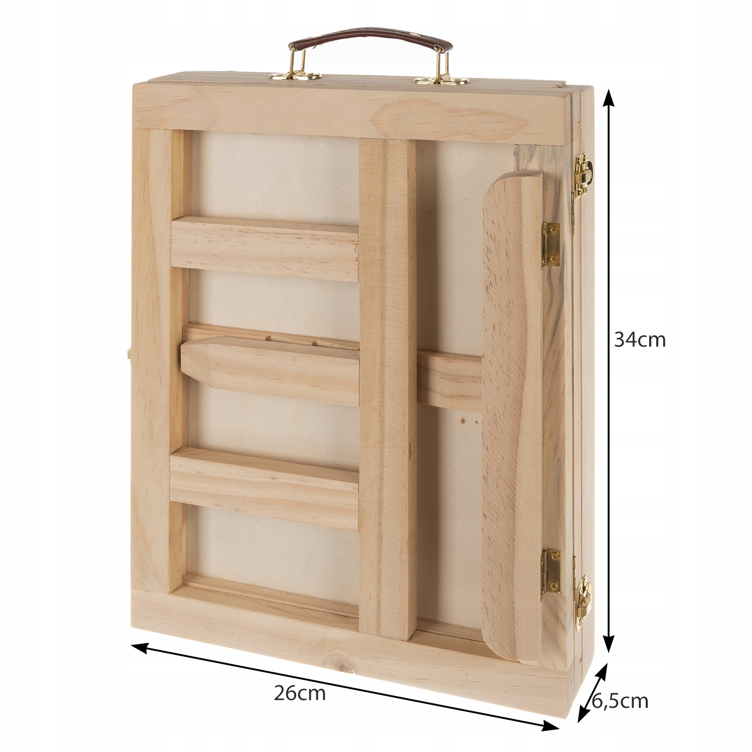 Настольный мольберт в чемодане – удобное решение для рисования. Деревянный кейс со встроенным мольбертом с регулировкой наклона на 4 градуса + держатель холста. Благодаря складной конструкции набор легко транспортировать. Также имеется кожаная ручка для переноски. Теперь вы можете брать с собой мольберт и рисовать на природе!