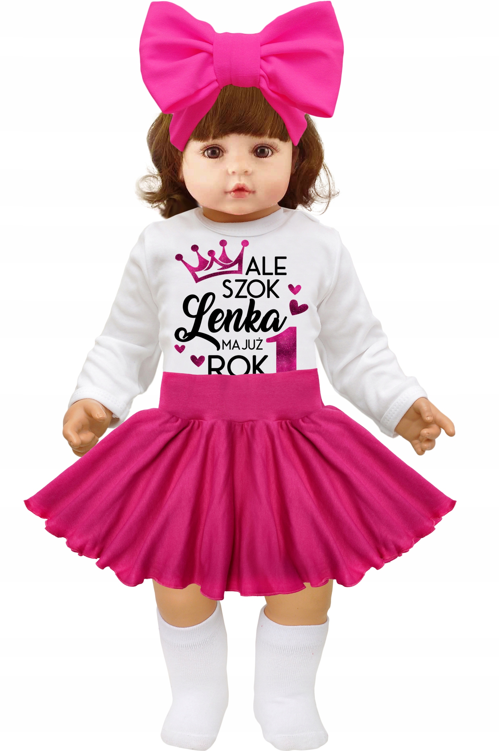 Очаровательный комплект из двух предметов на первый день рождения девочки. Комплект состоит из боди и юбки.