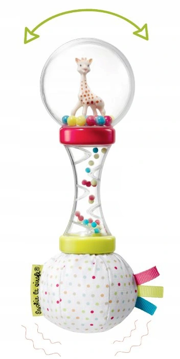 –красочная погремушка, легкая и удобная в захвате. На одном конце находится прозрачный шар с разноцветными шариками внутри, на другом - мягкий шарик, стимулирующий тактильные ощущения (маленькие «бирочки» развивают пальцы) и слуховые ощущения (шелест бумаги). Прозрачная ручка представляет собой тропу с препятствиями, развивающую чувство логики – что делать, чтобы шарики переправились на другую сторону? Не бросайте! Риск поломки.