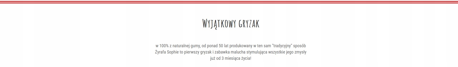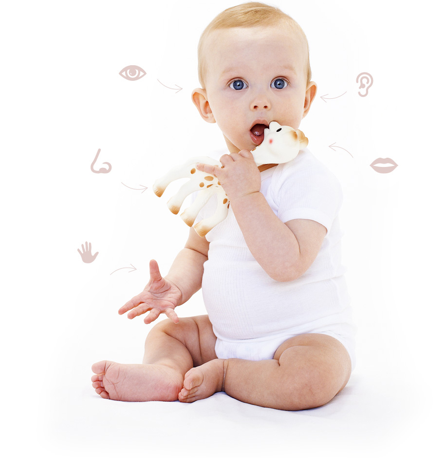 - классический прорезыватель «Жираф Софи», высотой около 18 см ., изготовлен из 100% латекса - смолы каучукового дерева. Натуральный материал, покрытый пищевой краской, безопасен для жевания, легок и гибок, что предохраняет от болезненных травм при раскачивании. Закругленные формы легко брать в руки маленькими ручками. Прорезыватель стимулирует и развивает 5 чувств: зрение - контрастные пятна, слух - пищалка, помещенная в живот, осязание - специфическое прикосновение резины, гладкой, как маминая кожа, обоняние - особый запах натурального каучука, позволяющий отличить прорезыватель из кучи других игрушек вкус — главное познавательное чувство малыша. Отличное средство при прорезывании зубов;