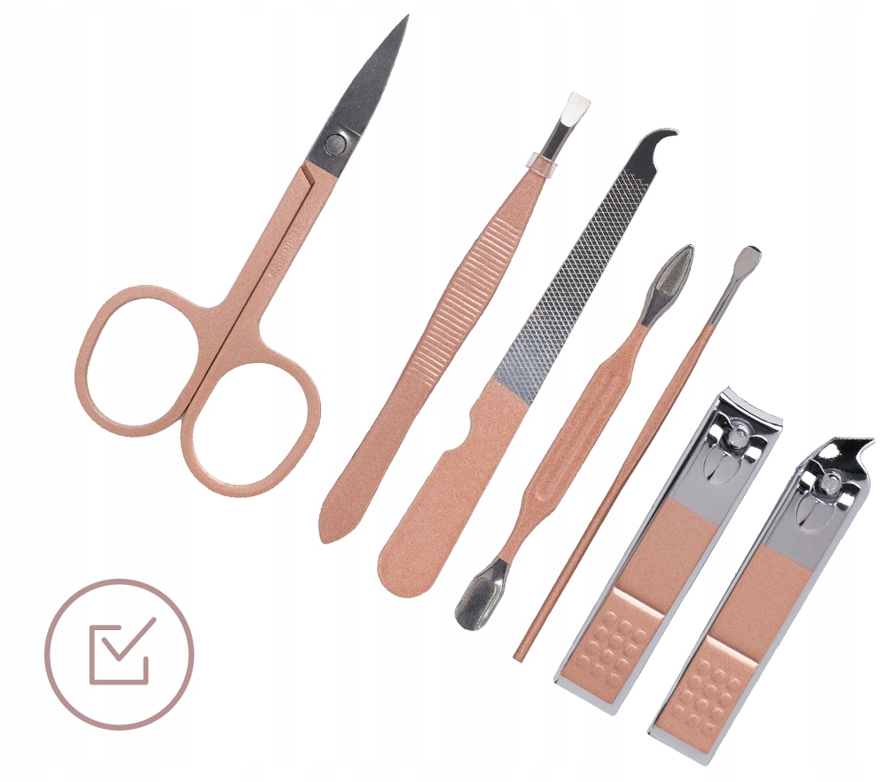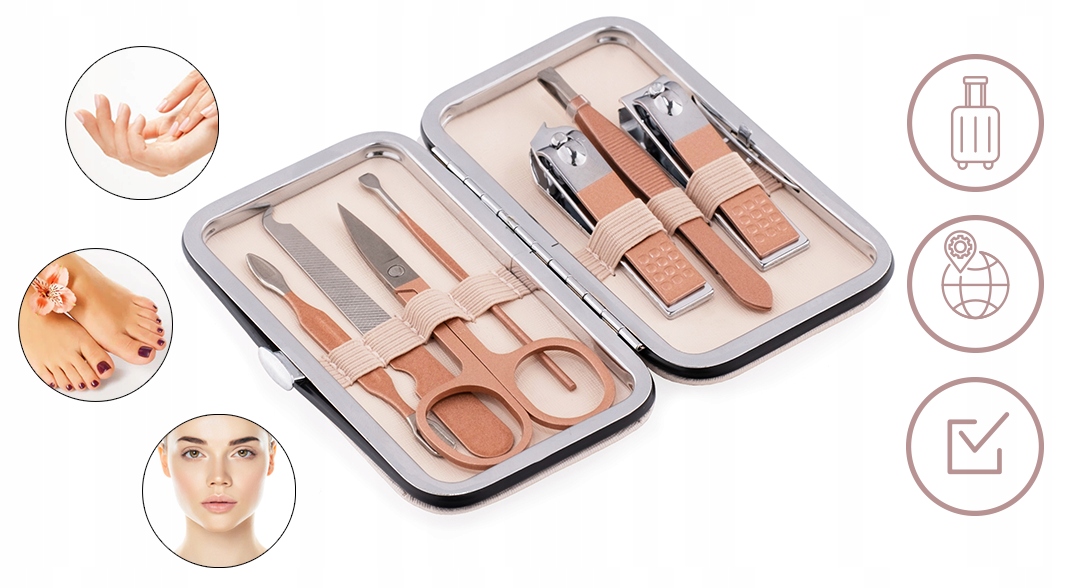 Набор из 7 косметических аксессуаров для маникюра, педикюра и оформления бровей в бежевом футляре. С помощью этого набора вы укоротите ногти, придадите им форму, удалите сухую кутикулу и подготовите ногти к дальнейшему уходу.