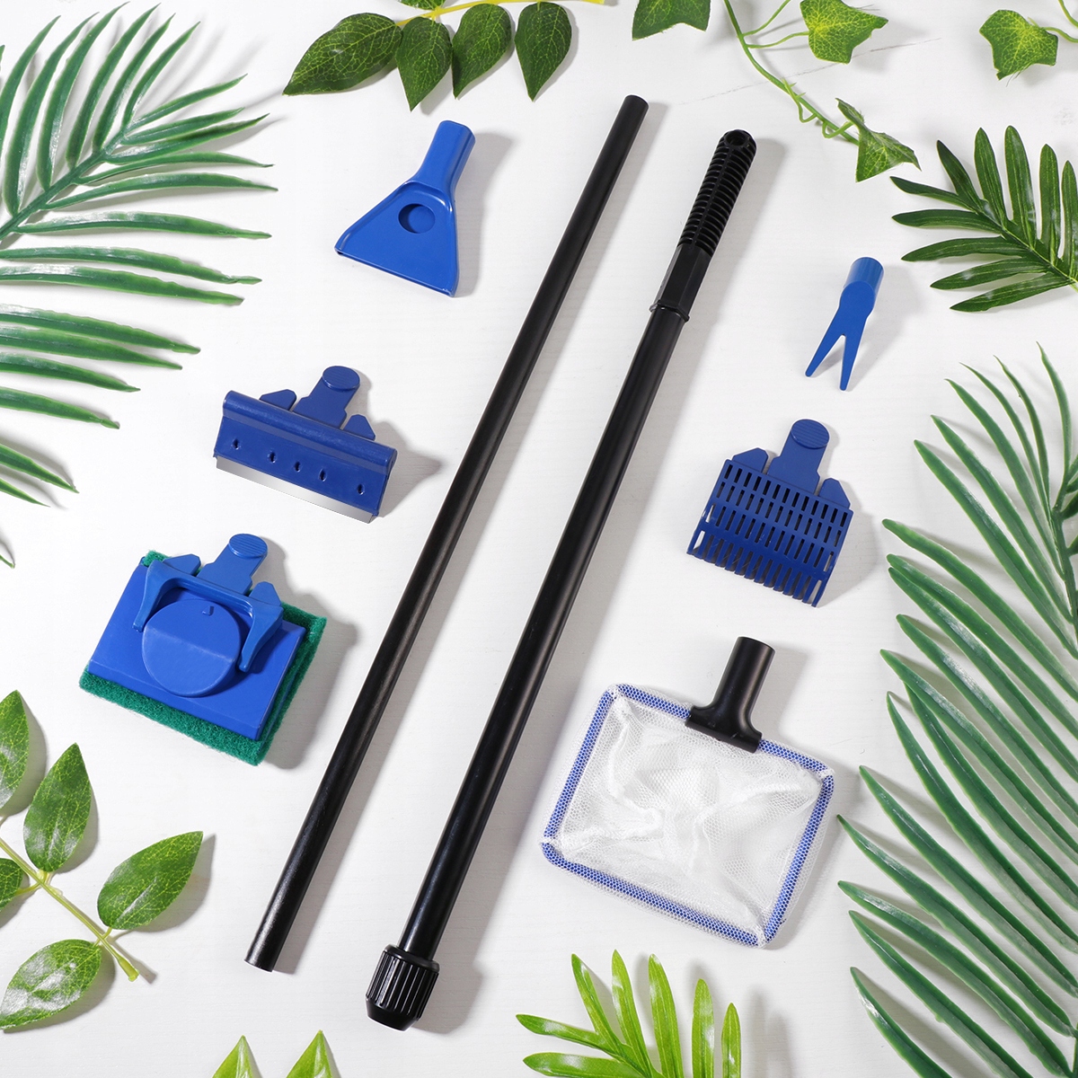 ✅UEETEK 5 в 1 набор для чистки стеклянного резервуара аквариума, гравийные грабли, скребок для водорослей, плоская вилка, губка (синий + черный)