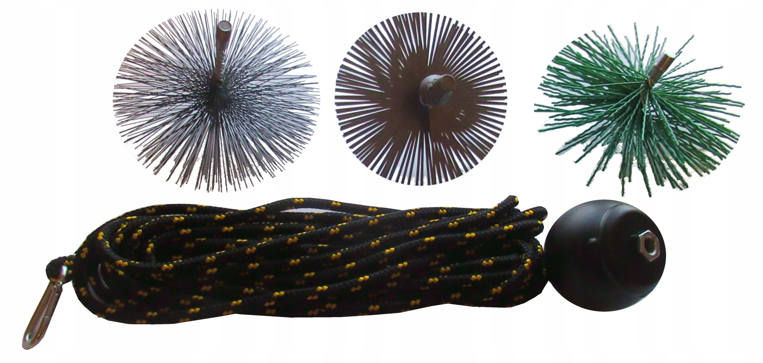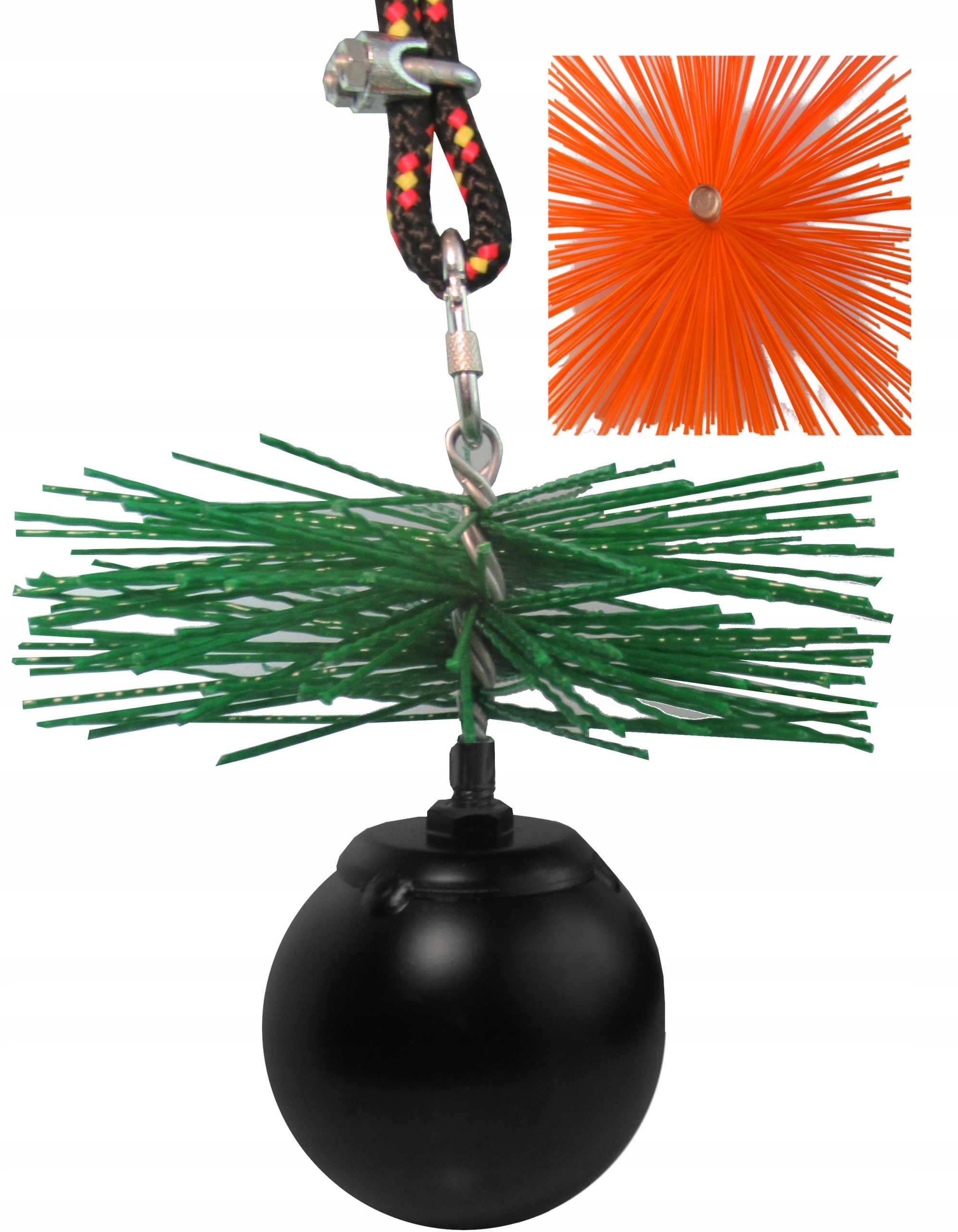 Комплект собирается путем прикручивания шарика к щетке с помощью резьбы, а затем веревки к проушину щетки с помощью карабина.