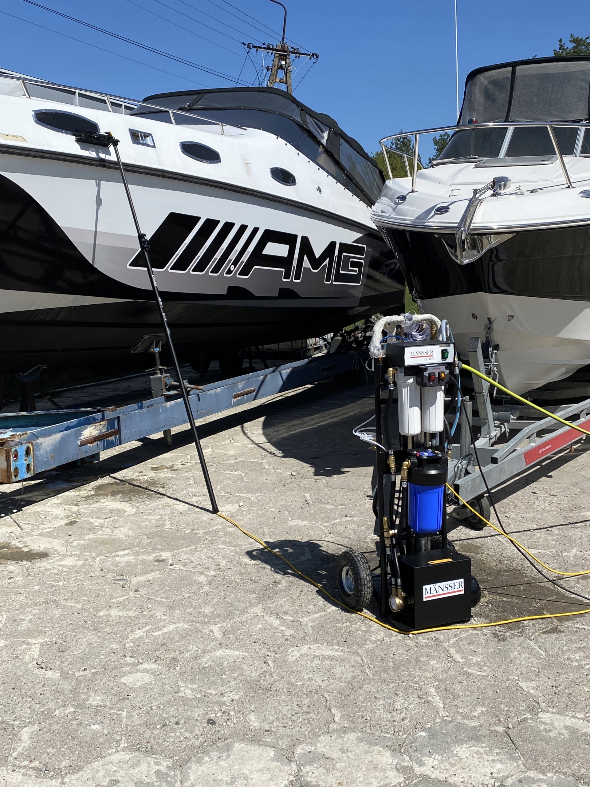 MANSSER приводится в движение электродвигателем и высокопроизводительным ротационным насосом, производящим до 8 л/мин чистой воды. По сравнению с конкурентами, данное устройство имеет в два раза более мощный двигатель и насос.