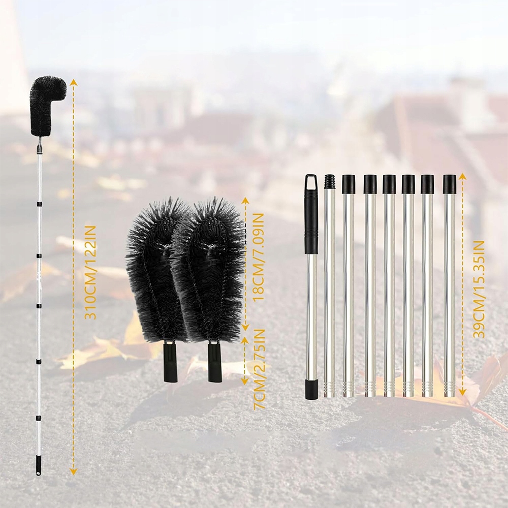 Инструменты для очистки желобов оснащены 8 стойками из высококачественного материала и 2 щеточными насадками. Максимальный радиус действия, включая насадку щетки, составляет примерно 3,1 м. Очищать желоба легко, поворачивая шест на нужную длину.