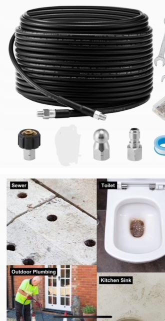 Шланг для очистки канализации длиной 15 метров, поворотная насадка для очистки канализации x 1, соединитель x 1 (внутренняя резьба M22 на внутреннюю резьбу 1/4 дюйма NPT), быстродействующий соединитель 1/4 дюйма x 1, гаечные ключи x 2, штифт коробка x1