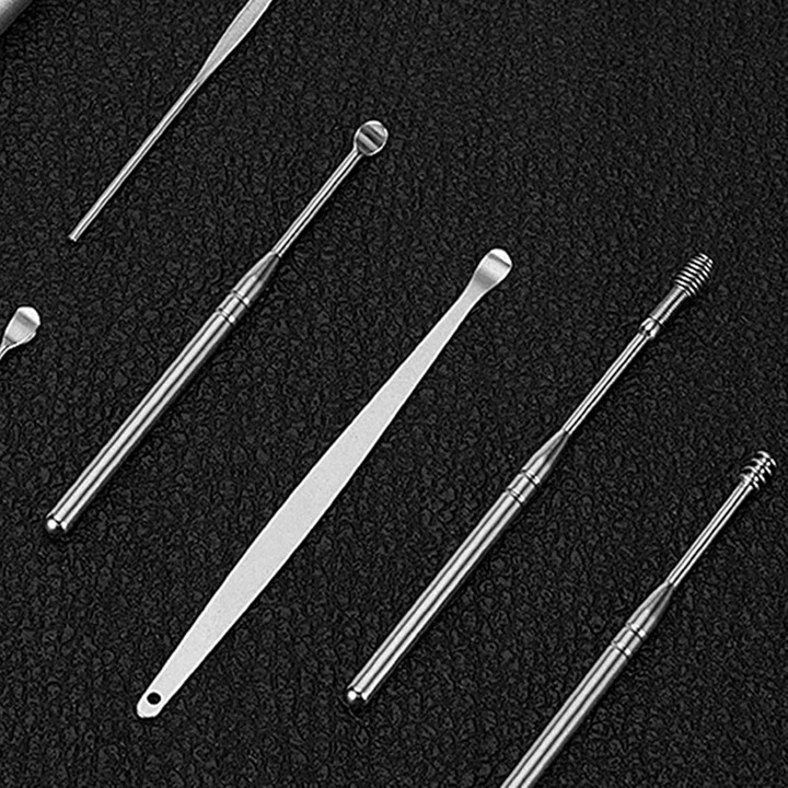 В комплект для удаления ушной серы входят 6 ложек с разными насадками, подходящими для разных типов загрязнений и потребностей в очистке.