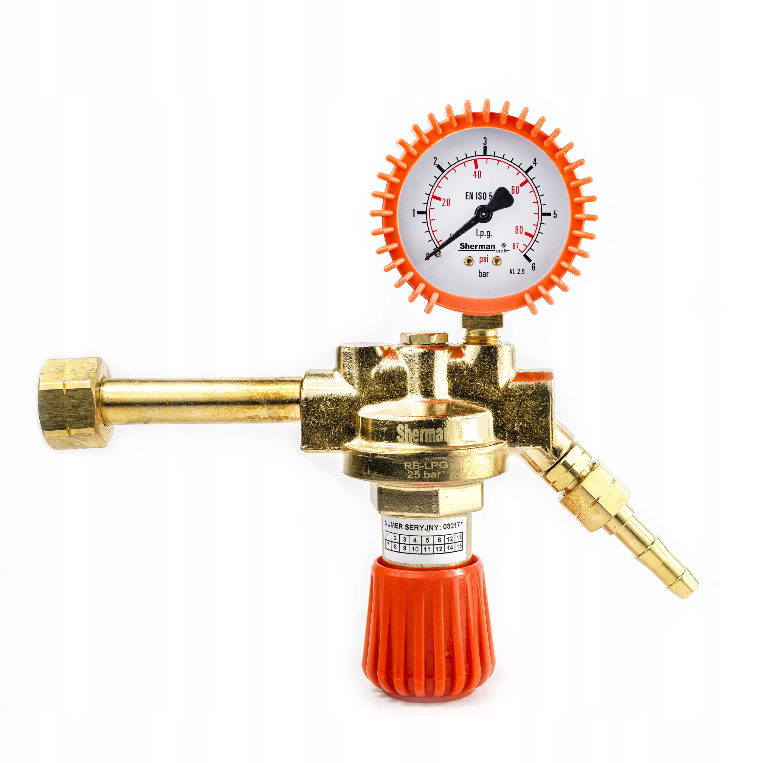 Высококачественный прочный баллонный редуктор серии 100 с запорным клапаном, предназначенный для пропана/бутана. Резьба гайки: 3/8" левая. Диаметр шланга: 8 мм. Производительность: 6 кг/ч. Давление на выходе: 4 бар/0,4 МПа. Давление на входе: 25 бар/2,5 МПа.
