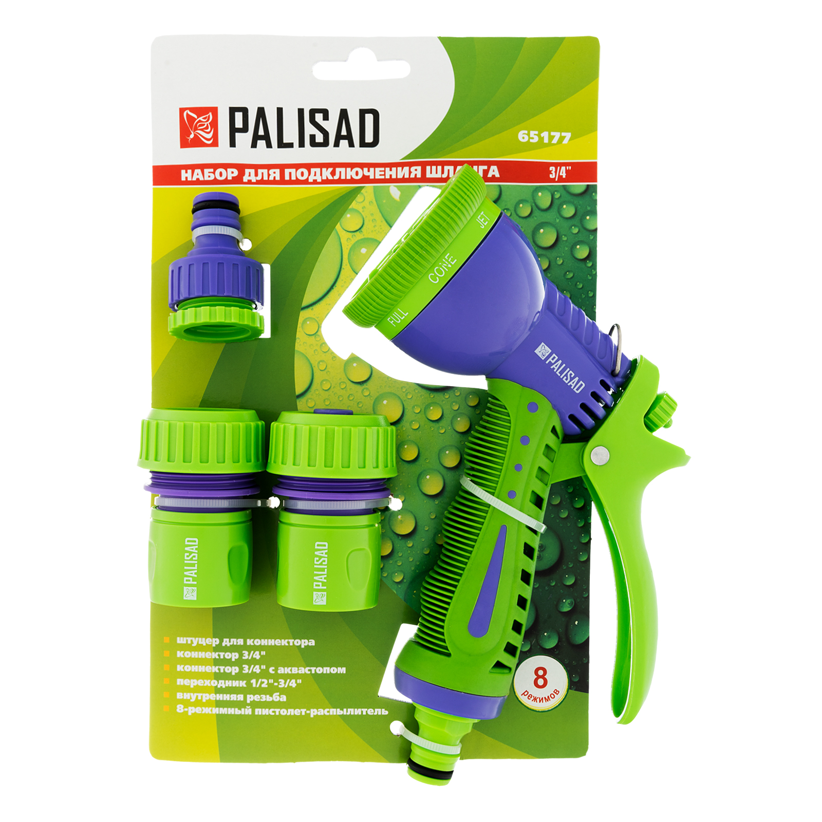 Набор для подключения шланга 3/4, пистолет с 8 режимами полива, переходник, 2 коннектора - Палисад
