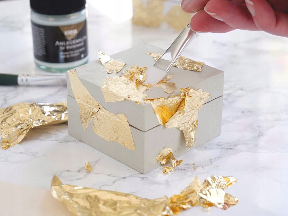 Позолота хлопьями выглядит красиво, но сделать ее несложно. С помощью набора вы легко сможете сделать уникальные украшения. Все, что вам понадобится, — это набор Kreul, предмет декора и немного терпения. В комплект входит грунтовка, лак на водной основе, хлопья позолоты и две кисточки. Техника идеальна для золочения предметов из дерева, цемента, картона и других гладких и пористых поверхностей.