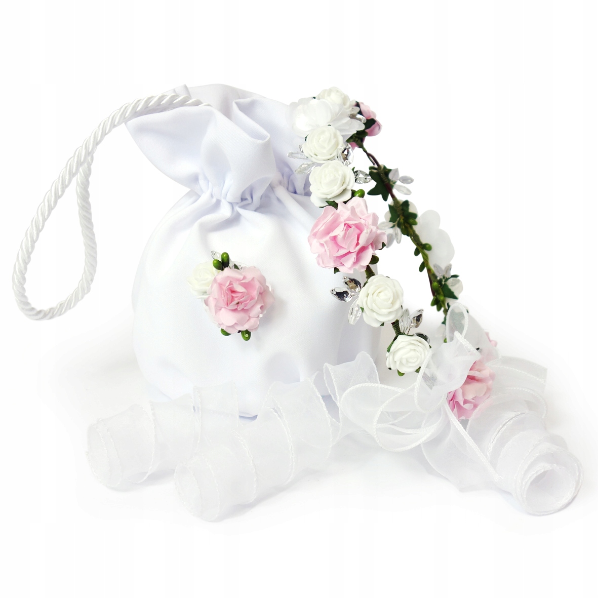Предлагаем комплект «Первое причастие» для девочки: СУМКА+ВЕНОК. Эти предметы являются важным дополнением к наряду каждой девушки для первого причастия. Сумка и венок целые - у них одинаковые цветы. В стоимость входит сумка, украшенная цветочной булавкой и венком.