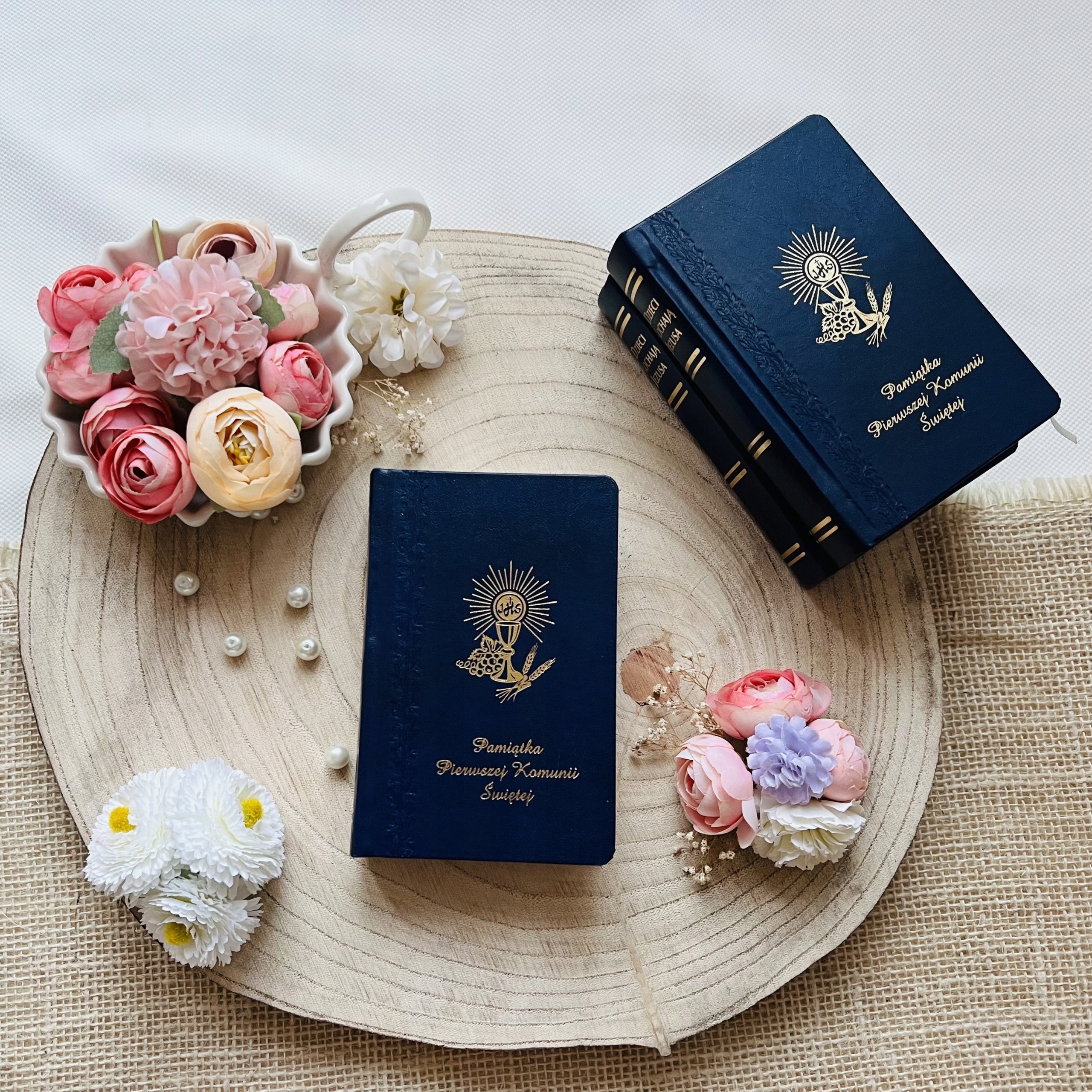 - МОЛИТВЕННИК - темно-синий, в ЖЁСТКОЙ коже- как обложка, размеры 109х71х22 мм, внутри 372 страницы и красивая графика. Крышка украшена сусальным золотом с надписью «Сувенир Первого Святого Причастия – Иисус, Мария, Иосиф».