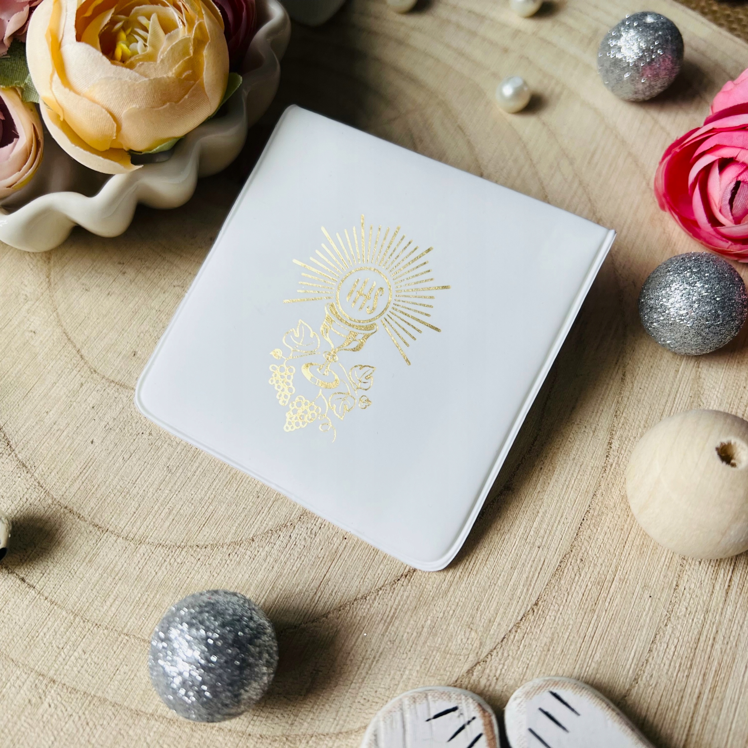 - Футляр для четок - белого цвета, материал под кожу, украшенный позолоченной чашей.