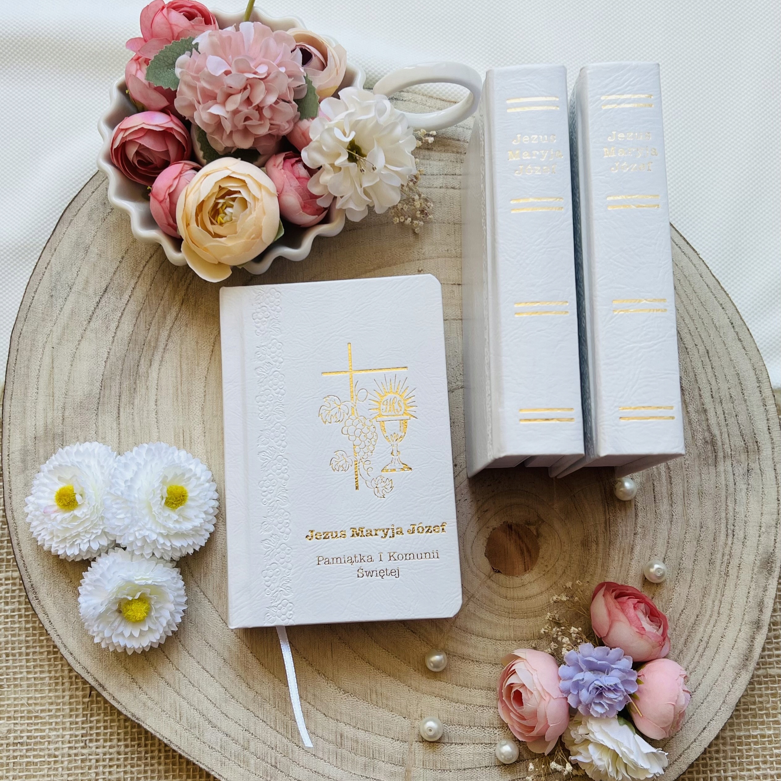 - МОЛИТВЕННИК - белый, в ЖЕСТКОЙ обложке под кожу, размеры 109x71x22 мм, 372 страницы и красивая графика внутри. Крышка украшена сусальным золотом с надписью «Сувенир Первого Святого Причастия – Иисус, Мария, Иосиф».