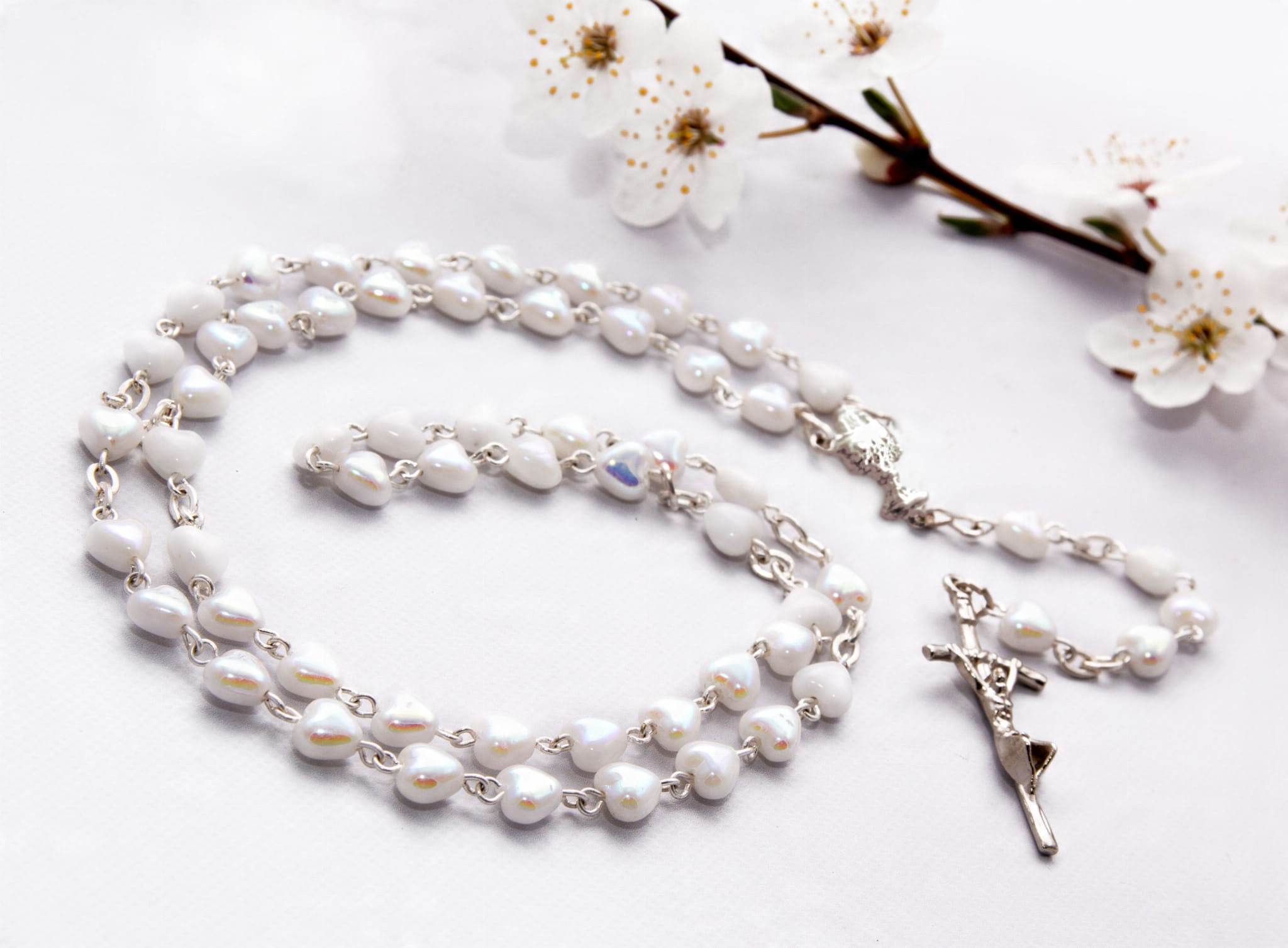 Высококачественный набор атрибутов Первого причастия. В комплект входят четки в элегантном позолоченном футляре, книга для Первого причастия - Иисус, Мария, Иосиф и свеча для Первого причастия с каплесборником.