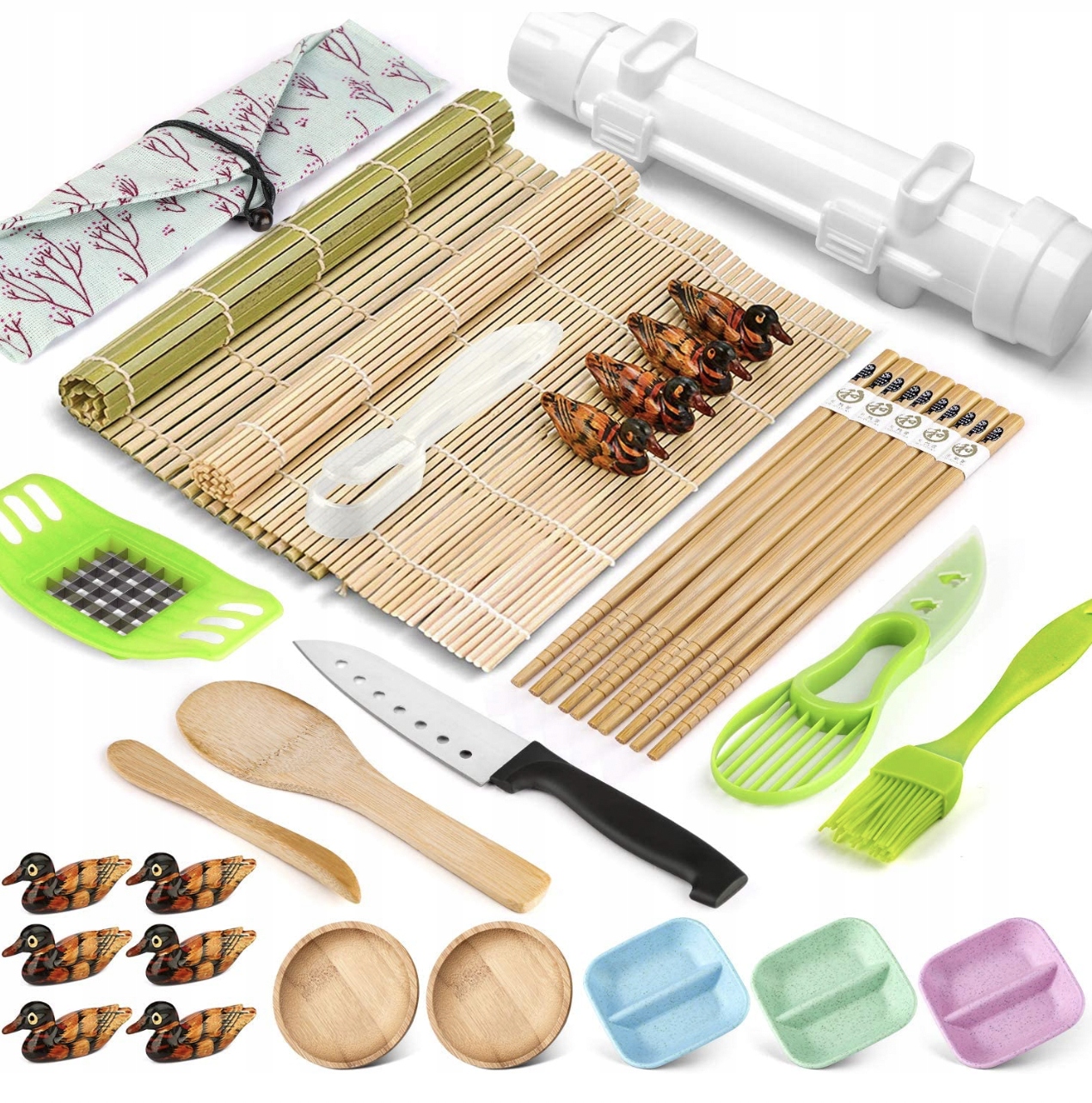 Набор содержит до 28 элементов. В этом наборе базуки для суши есть все необходимое для полноценного приготовления суши. В набор входят бамбуковые коврики, палочки для еды, подставки для палочек, базуки, режущие инструменты и многое другое.