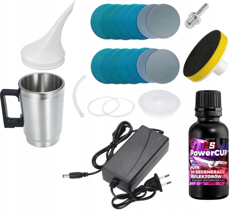 Перед нанесением жидкости фару следует отшлифовать наждачной бумагой, без этого эффекта нет! (это относится ко всем наборам этого типа, представленным на рынке!) Помимо жидкости и чашки, в комплект HS PowerCUP также входит набор из 14 абразивных дисков (P800-P3000), а также амортизирующая головка и Переходник М14 - вы получаете набор элементов, необходимых для полной регенерации лампы.