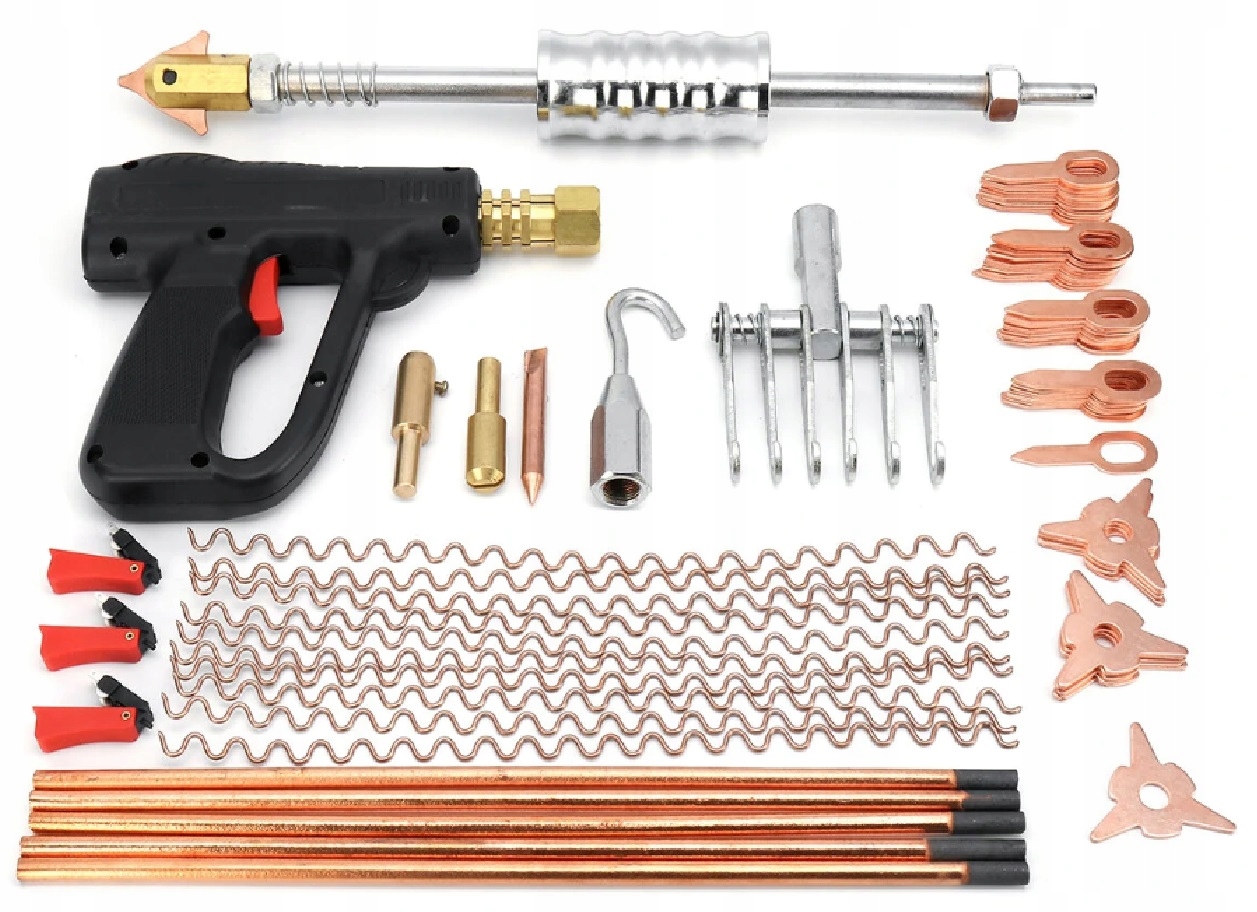 В набор для ремонта вмятин входят инструменты, позволяющие устранить большинство повреждений автомобиля тело.Содержит, среди прочего: инерционный молоток, пистолет для точечной сварки и различные виды кронштейнов, шайб и стержней.