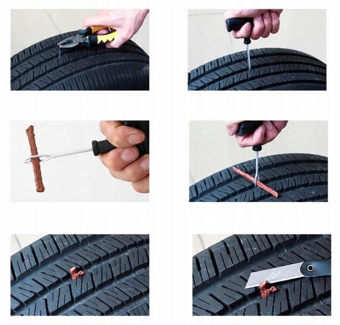 2. Используйте резак, чтобы очистить отверстие для гвоздя, затем смажьте резак прилагаемым клеем и вставьте его в отверстие, оставленное гвоздем, в соответствии с углом, под которым гвоздь вошел в шину, чтобы хорошо заполнить отверстие клеем.