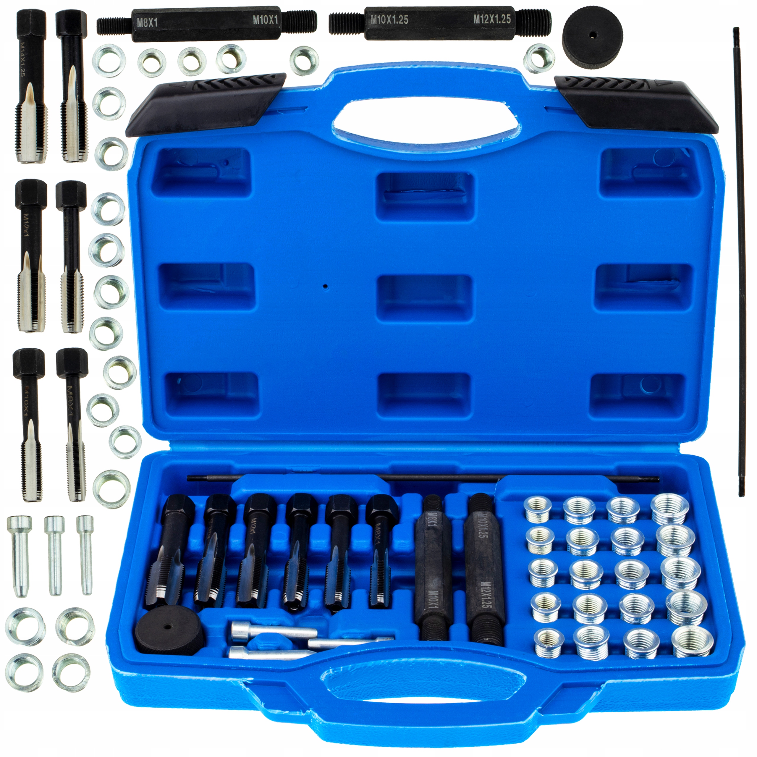 Комплексный комплект подходит для ремонта резьбы свечей накаливания размером 8 мм, 10 мм (шаг 1,0 и 1,25) и 12 мм. В комплект входят инструменты для точной установки резьбовых вставок в головку и имеется уникальная система направляющих метчиков, обеспечивающая их правильное позиционирование. Дополнительно в комплект входят переходники с резьбой четырех размеров, подходящие для типоразмеров свечей накаливания.