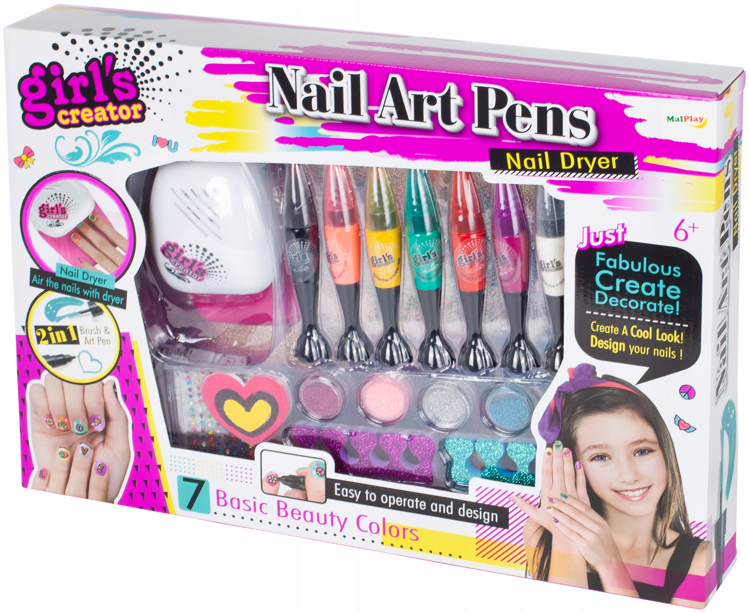 7 разных цветов лака для ногтей, 4 блестки и наклейки сделают украшение ваших ногтей ограниченным только вашей фантазией.