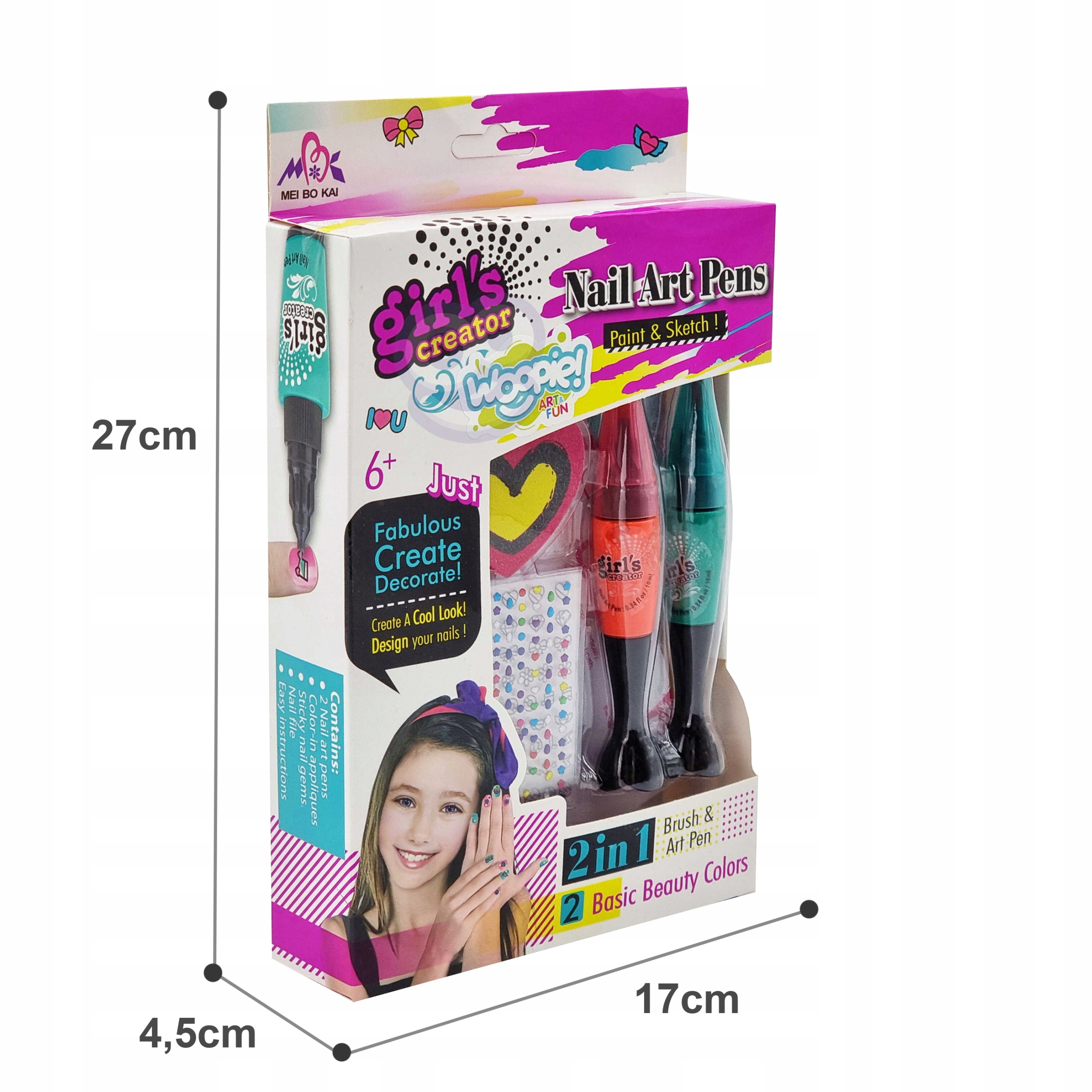 Набор для росписи ногтей от бренда WOOPIE от ART&FUN серия b>познакомит девушек с миром моды и позволит им создать свой собственный стиль! Набор выглядит как в настоящем салоне красоты. В комплект входят: 2 лака для ногтей, набор наклеек для ногтей, набор наклеек, черные узоры и пилочка-сердечко. Просто нанесите лак и фурнитуру и дайте высохнуть! Набор 100% безопасен для детей. Набор развивает первые интересы, ручные навыки и, прежде всего, воображение и творческие способности. б> в создании неповторимого стиля!