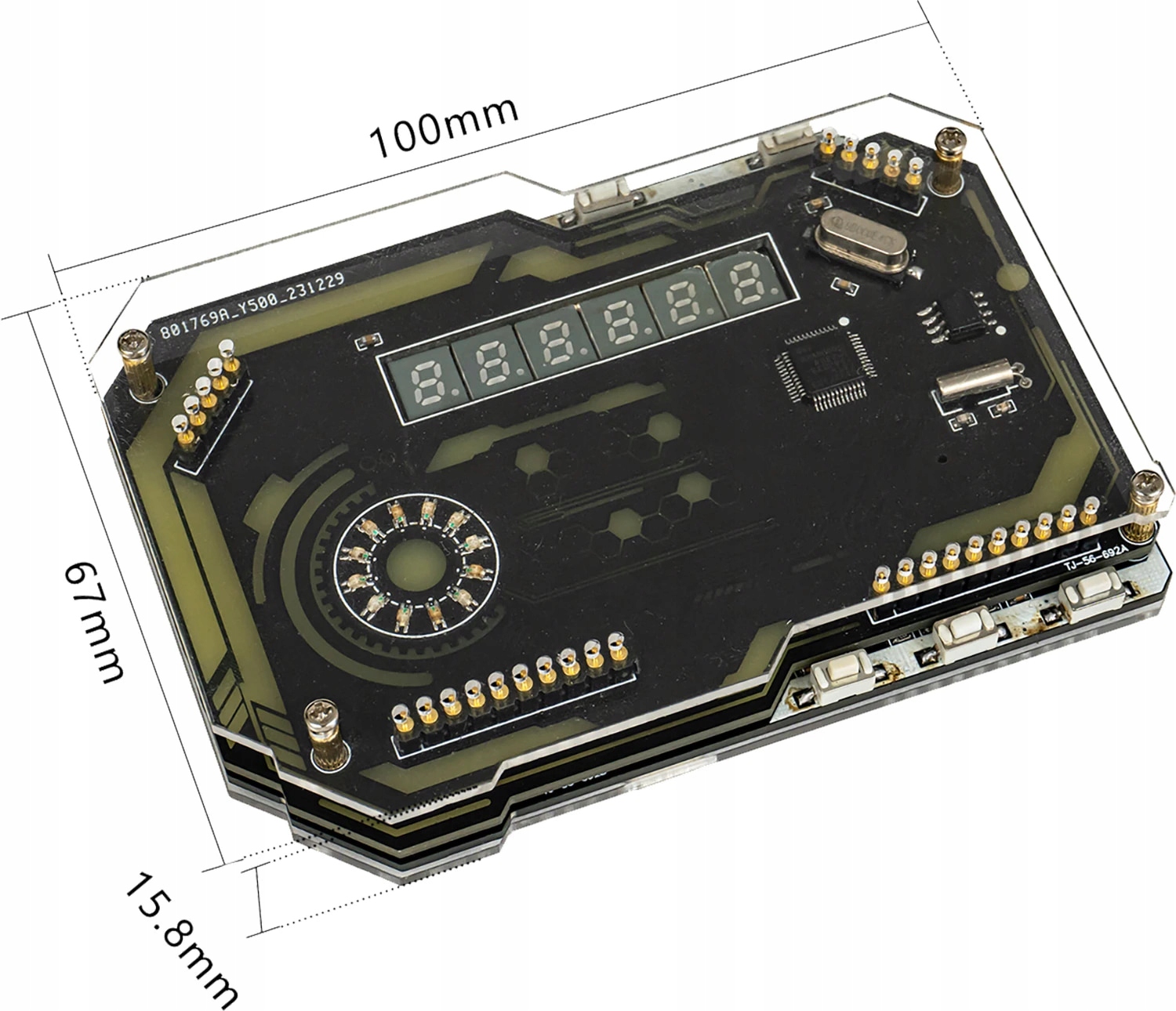 Технические характеристики: Дисплей 6 × 0,36-дюймовые цифровые трубки SMD Освещение 60 × светодиодов SMD RGB высокой яркости Мощь 5 В постоянного тока (тип C) Размеры 100 × 67 × 15,8 мм (компактный настольный размер) Особенные функции Память при сбое питания, регулируемые эффекты RGB