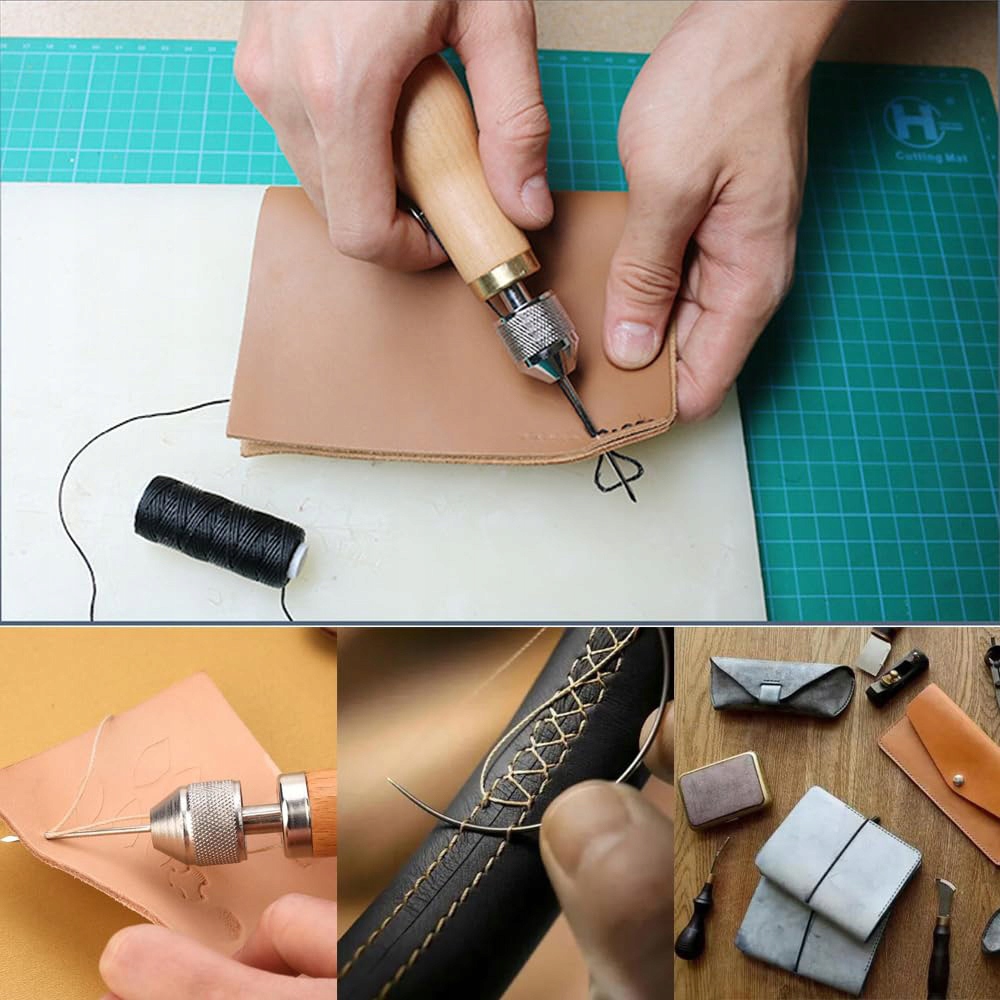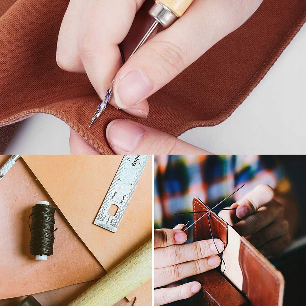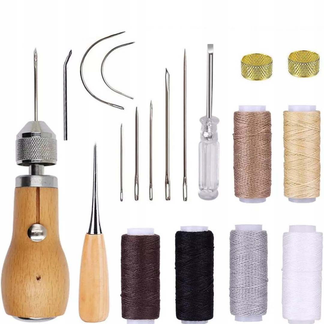 Набор для шитья кожи: Этот набор инструментов для шитья кожи включает 1 прочное шило (включая 2 иглы, петлитель и коническую иглу), 1 шило, 6 вощеных ниток, 1 отвертку, 7 игл для ручного шитья и 2 латунных кольца наперстка. Этот набор удовлетворит все ваши потребности в шитье из кожи.