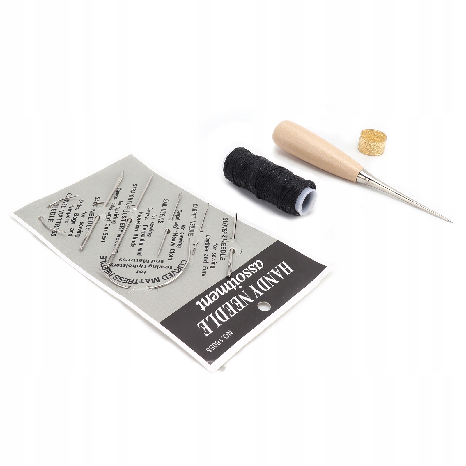 Набор для шитья из кожи с иглами, вощеной нитью, шилом и наперстком.