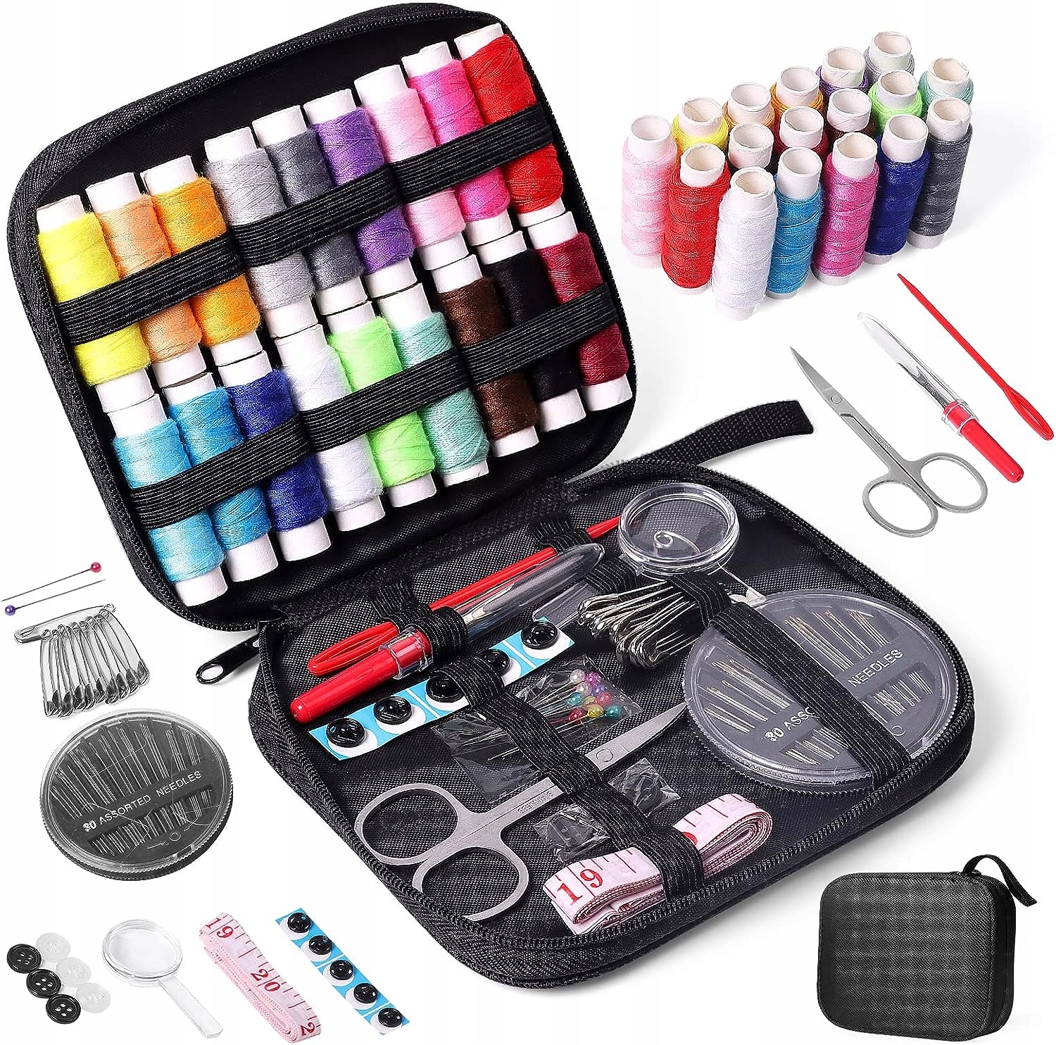 - Все, что вам нужно в шитье - швейный набор содержит все необходимые инструменты, необходимые для выполнения основного ремонта, будь то иглы, нитки, ножницы из нержавеющей стали. , потайные пуговицы, инструменты для заправки ниток, инструменты для заправки нитей, вспарыватель швов, рулетка, булавки, карандаш для ткани, вспарыватель швы.