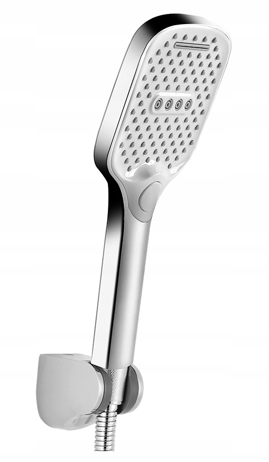 Трехфункциональная, прямоугольная душевая лейка со шлангом и настенным держателем. Изготовлена из твердого и прочного материала, покрыта слоем хрома. . p>