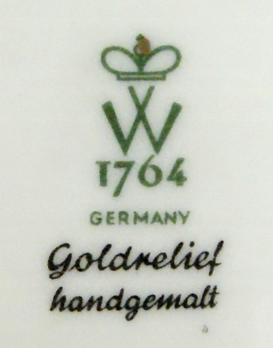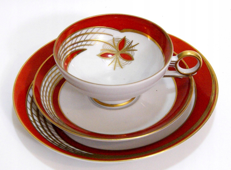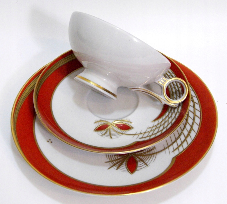 Предмет аукциона — красивый старинный сервиз для завтрака. Красно-белый фарфор, декорированный рельефно-выпуклым золотом. Валлендорф.
