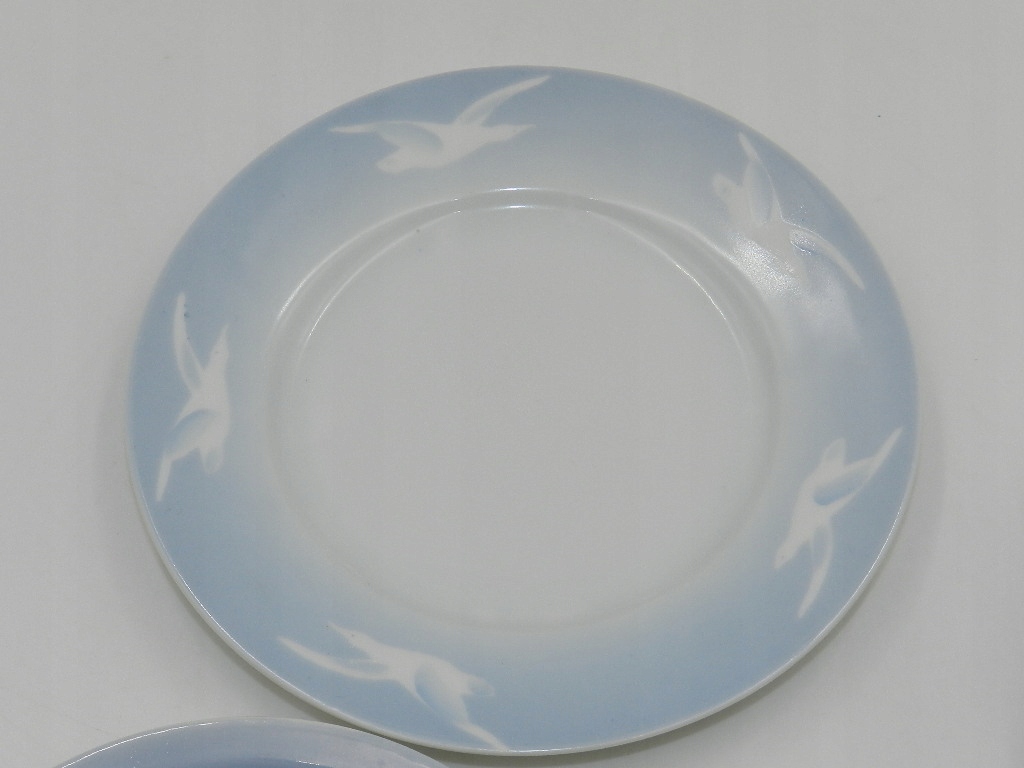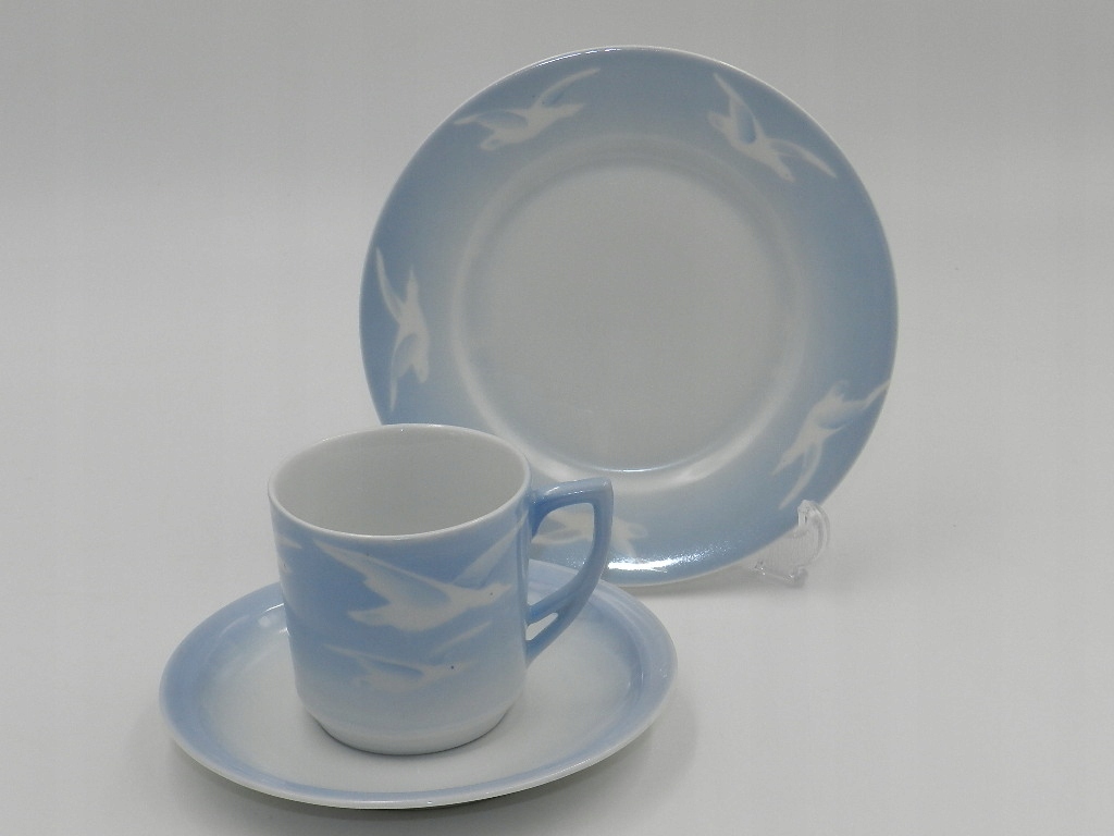 Очень интересное, редкое украшение, настолько отличающееся от тех дизайнов, которые у нас ассоциируются с фабрикой в Старом Здруе. Белый фарфор с заштрихованными полосками, бледно-голубая роспись с изображением чаек в полете.