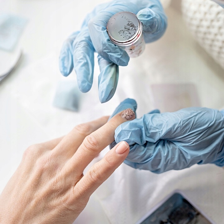 3️⃣ Примените силиконовый штамп для рисунка. Покачивающими движениями соберите рисунок, созданный лаком, и нанесите его на кончики или ноготь.