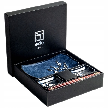 Элегантный набор для сервировки суши с мотивом белых цветов красивого темно-синего цвета. Изысканный и практичный, он подойдет как для повседневного использования, так и для повседневной сервировки стола. Оригинальная посуда в духе достойной японской эстетики привнесет в ваш дом поистине восточный колорит и придаст пышности каждому блюду.