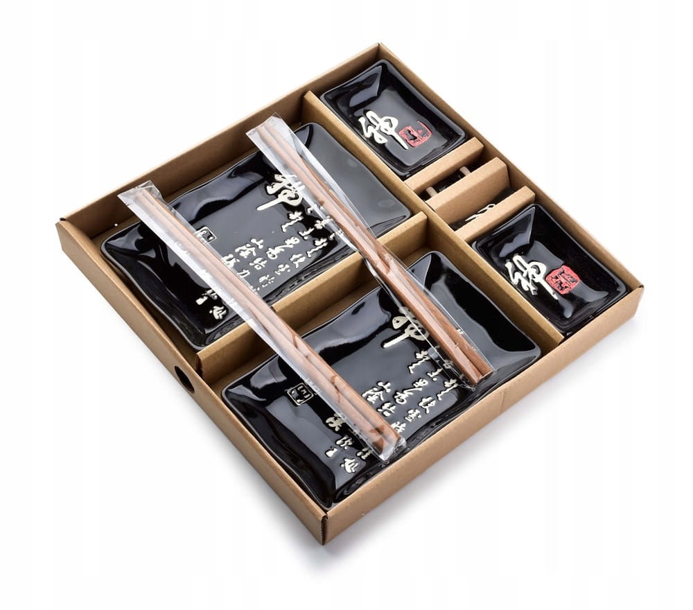 Стильный, а главное, практичный и элегантный набор для подачи суши на двоих. В набор входят тарелки, миски, палочки для еды и подставка для палочек. Он был оформлен в оригинальном японском стиле с цветочным мотивом и надписями.