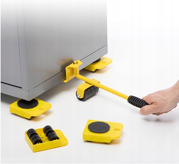 Содержит инструкции по правильному использованию. Просто поместите лезвие рычага под прибор, мебель или предмет, который нужно переместить; переместите рычаг вниз, чтобы поднять его, затем прикрепите опоры с колесами, и вы сможете повернуть его в нужном направлении и транспортировать к месту назначения.