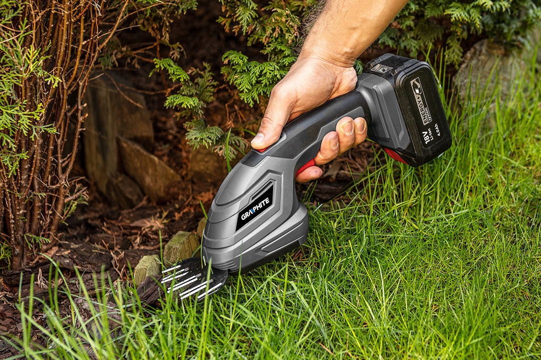 Триммер для травы 3в1 Energy+ 18 В без аккумулятора 58GE119 от GRAPHITE — инструмент, предназначенный для ухода за кустарниками, живой изгородью и коррекции кромок газона. Он работает на основе системы Energy+ и работает от литий-ионного аккумулятора напряжением 18 В (рекомендуемая емкость — 4 Ач). Инструмент предлагается в наборе с тремя насадками – ножницами для травы, ножницами для живой изгороди и трезубцем. Ручка имеет крепление 3/8 дюйма. Ширина реза у триммера – 100 мм, у ножниц (с длиной лезвия 200 мм) – 70 мм и у трезубцев – 75 мм. Триммер отличается легкой заменой насадок. Встроенный замок переключателя обеспечивает безопасность, а мягкая ручка повышает комфорт использования устройства. Время работы от аккумулятора емкостью 2 Ач составляет 1 час 55 минут. Триммер марки ГРАФИТ – инструмент для каждого сада и приусадебного участка.