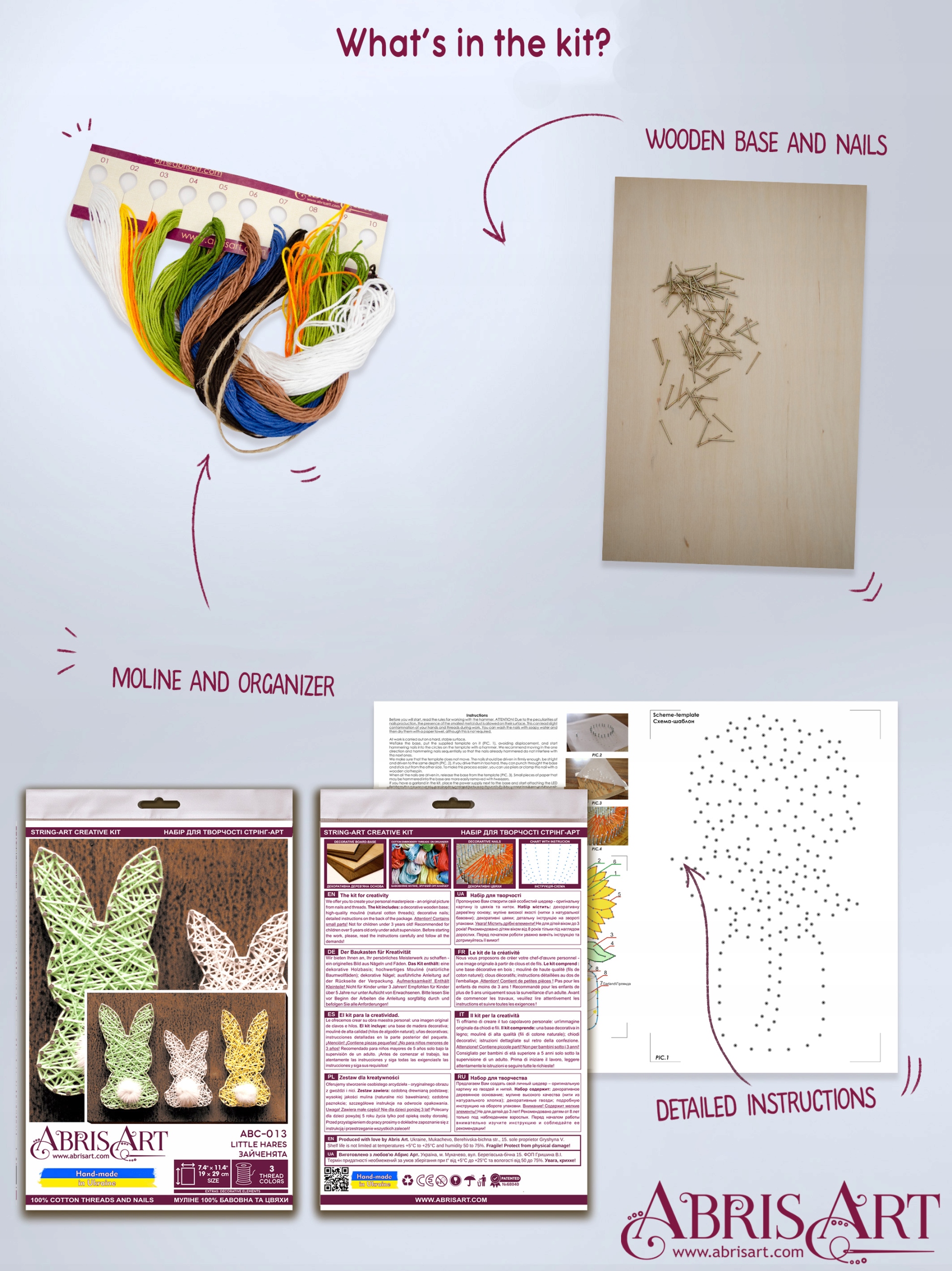 Набор для творчества на нитках "Зайчонки". Набор для творчества своими руками для начинающих и продвинутых вышивальщиц. Набор для творчества на нитках от Abris Art , Украина: стильное оформление стен.