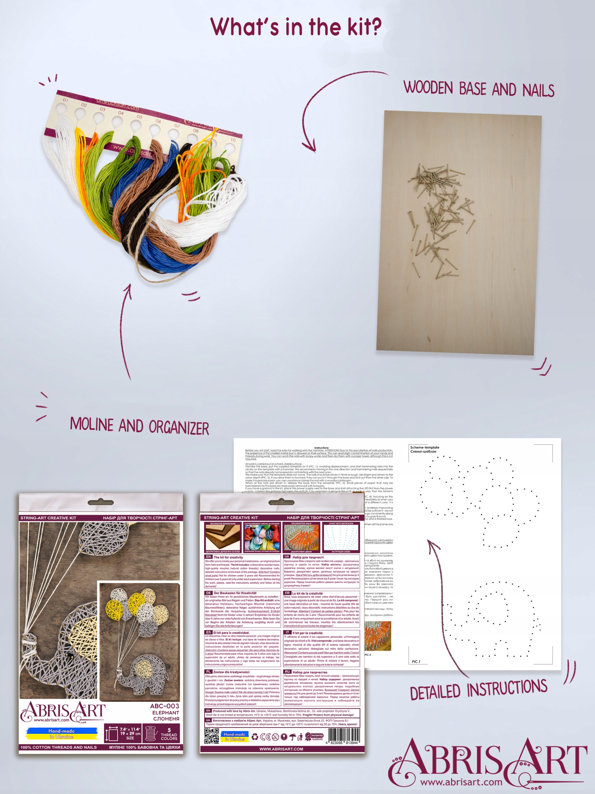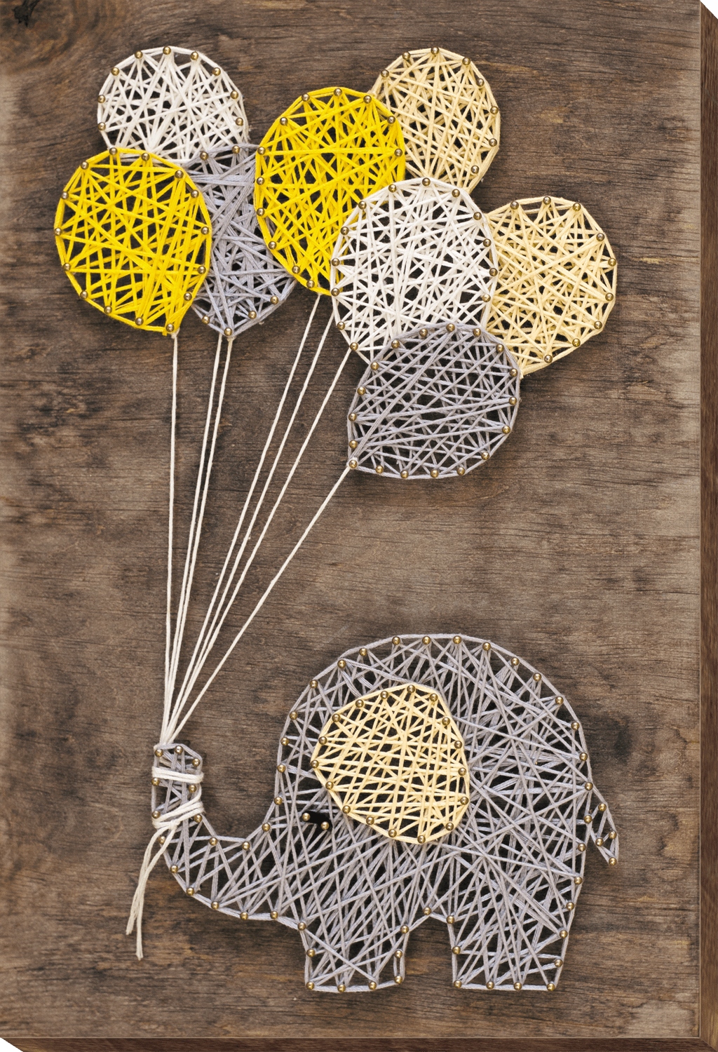 Эскиз слона предварительно напечатан на деревянной доске, что позволяет новичкам легко имитировать его. Цвета струн, входящих в комплект, тщательно подобраны, чтобы обеспечить красивые и гармоничные цвета готового изделия. Гвозди также имеют высочайшее качество, что обеспечивает плавный и легкий процесс забивания.