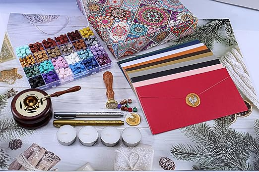 Набор содержит около 720 восковых бусин в 24 восхитительных цветах, восковом обогревателе, плавильном ложке, штампе, двух маркерах, четырех белых свечах, десять конвертов и элегантной коробкой.