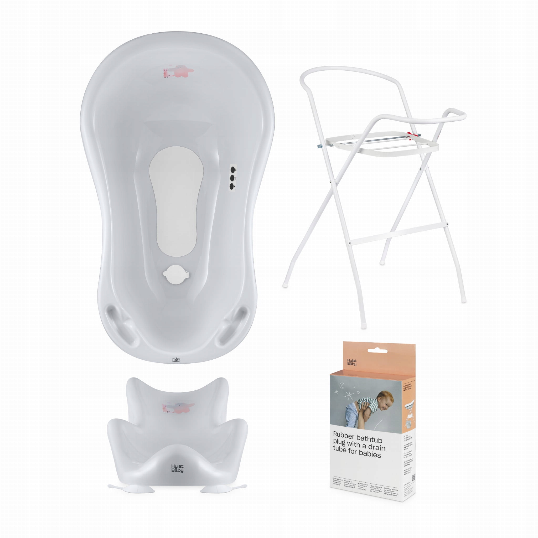- 4 в 1: ванна с ковриком и термометром, сиденье для ванны, подставка и слив с пробкой.